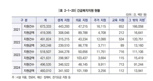 긴급복지 지원금액은 2021년 4193억원9500만원에서 2022년 3432억원4800만원으로 줄어든 뒤 2023년 4216억3100만원, 2024년 4600억1000만원 등 다시 늘어나는 추세다.