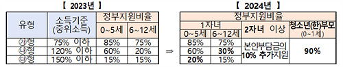 여가부는 아이돌봄서비스를 이용하는 가구에 소득수준별로 차등해 지원했으나 올해부터는 지원 확대에 따라 2자녀 이상 가구에 본인부담금의 10%를 추가 지원한다.
