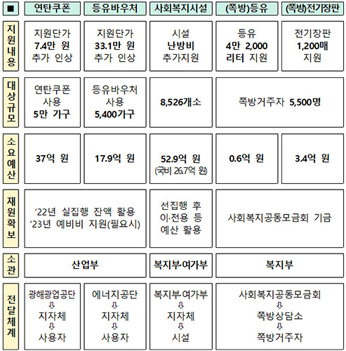 먼저 연탄쿠폰과 등유바우처 지원확대를 통해 기존에 지원받던 5만 5400가구에 대해 추가로 54억9000만원이 한시적으로 긴급 추가지원된다.