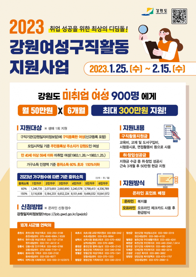 신청자격은 모집 시작일인 25일 현재 주민등록상 주소지가 강원도이며 40세 이상 59세 이하의 기준중위소득 60% 이상 150% 이하의 미취업 여성으로 2019~2022년도 기지원 사업대상자와 유사사업 동시‧중복 참여자는 신청대상에서 제외된다.