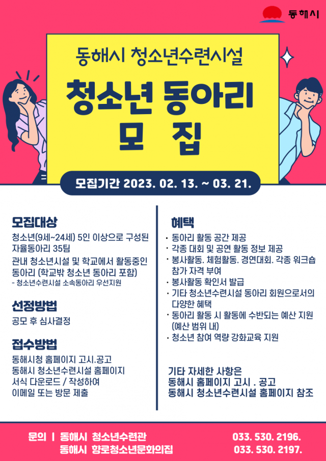 청소년동아리 지원 신청은 3월 21일까지 이메일 등으로 신청이 가능하며, 동아리 선정심사위원회의 심사를 거쳐 3월 31일 최종 발표될 예정이다.