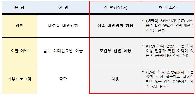 현재 비접촉 방식으로만 허용되던 면회 제한이 폐지되고, 대면접촉면회가 가능하다. 면회객이 대면접촉면회를 하기 위해서는 면회를 하기 전에 코로나19 자가진단키트(RAT) 검사에서 음성 확인을 받아야 한다.
